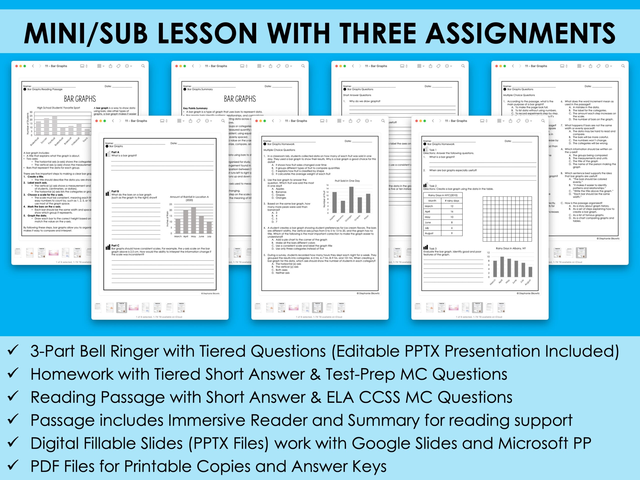 A pack of activities perfect for a mini-lesson or sub plans! Three-part bell ringer designed to be a warm-up or exit slip. Homework with tiered short answer and multiple choice standardized test-style questions. Reading passage with short answer and multiple choice ELA CCS questions. Immersive reader capabilities allow passage to be read aloud or translated into 200+ languages. Printable and digital activities included.