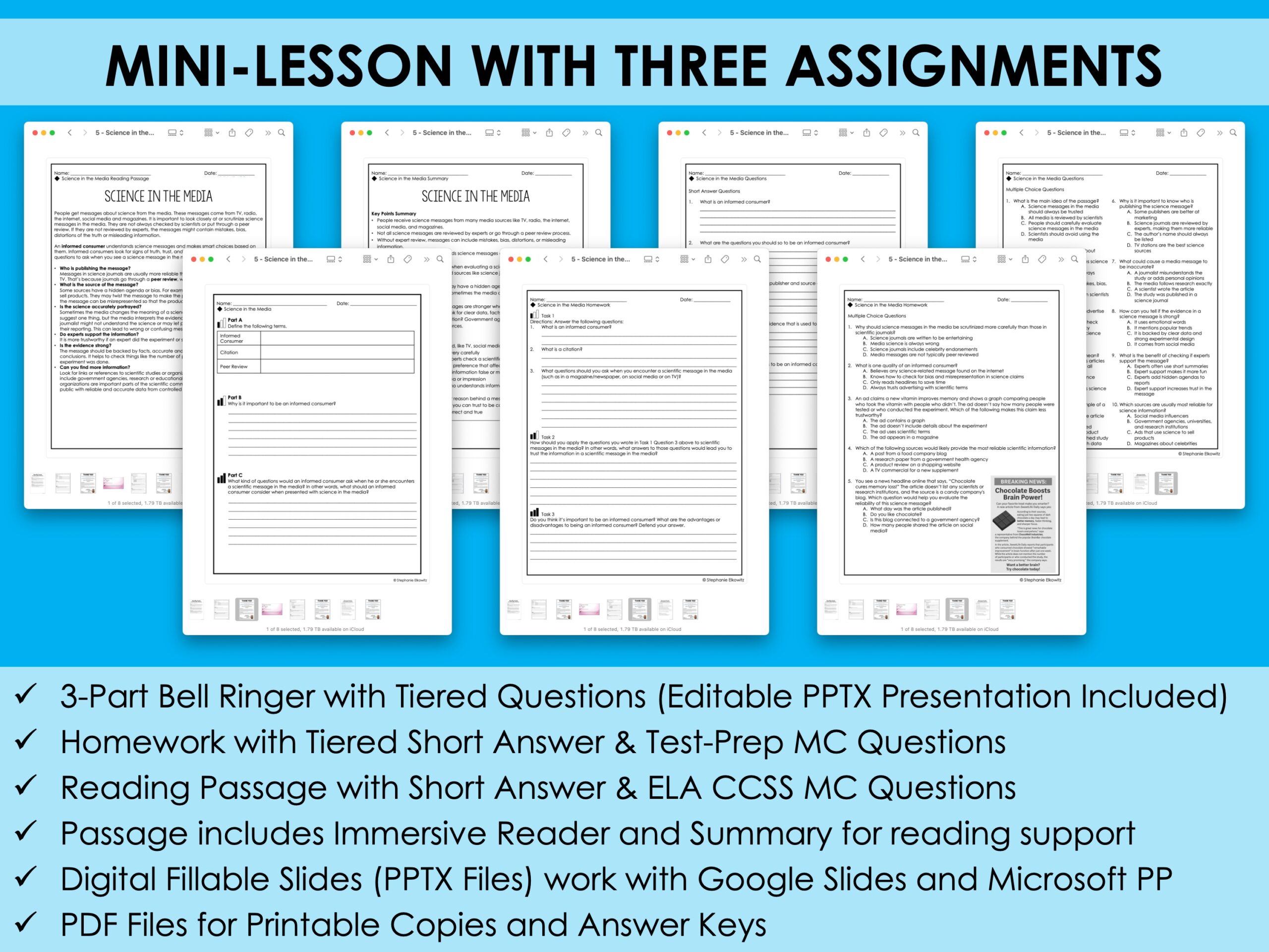 A one-page reading passage with text-dependent comprehension questions. Includes Immersive Reader and a one-page summary of key ideas and vocabulary. Includes five short answer questions tiered to Bloom’s Taxonomy and 10 multiple choice questions aligned with Middle School ELA CCSS RI.1 – RI.10. Designed to be completed in 20 – 30 minutes.