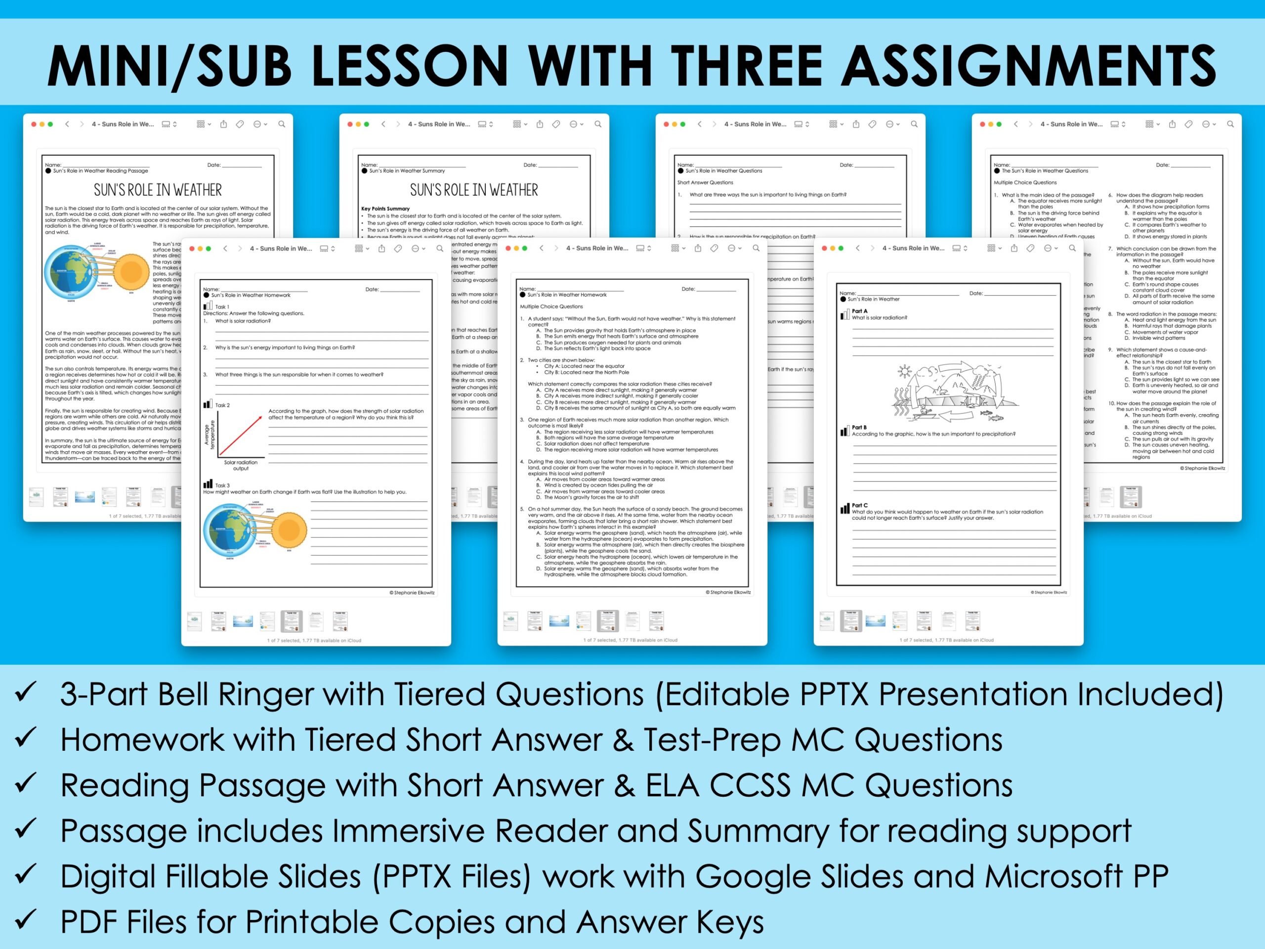A two-page activity. The first page is a three-part activity with short answer questions tiered to Bloom’s taxonomy. The second page includes five standardized test-style multiple choice questions focused on NGSS and DCI. Designed to be completed in 20 minutes.