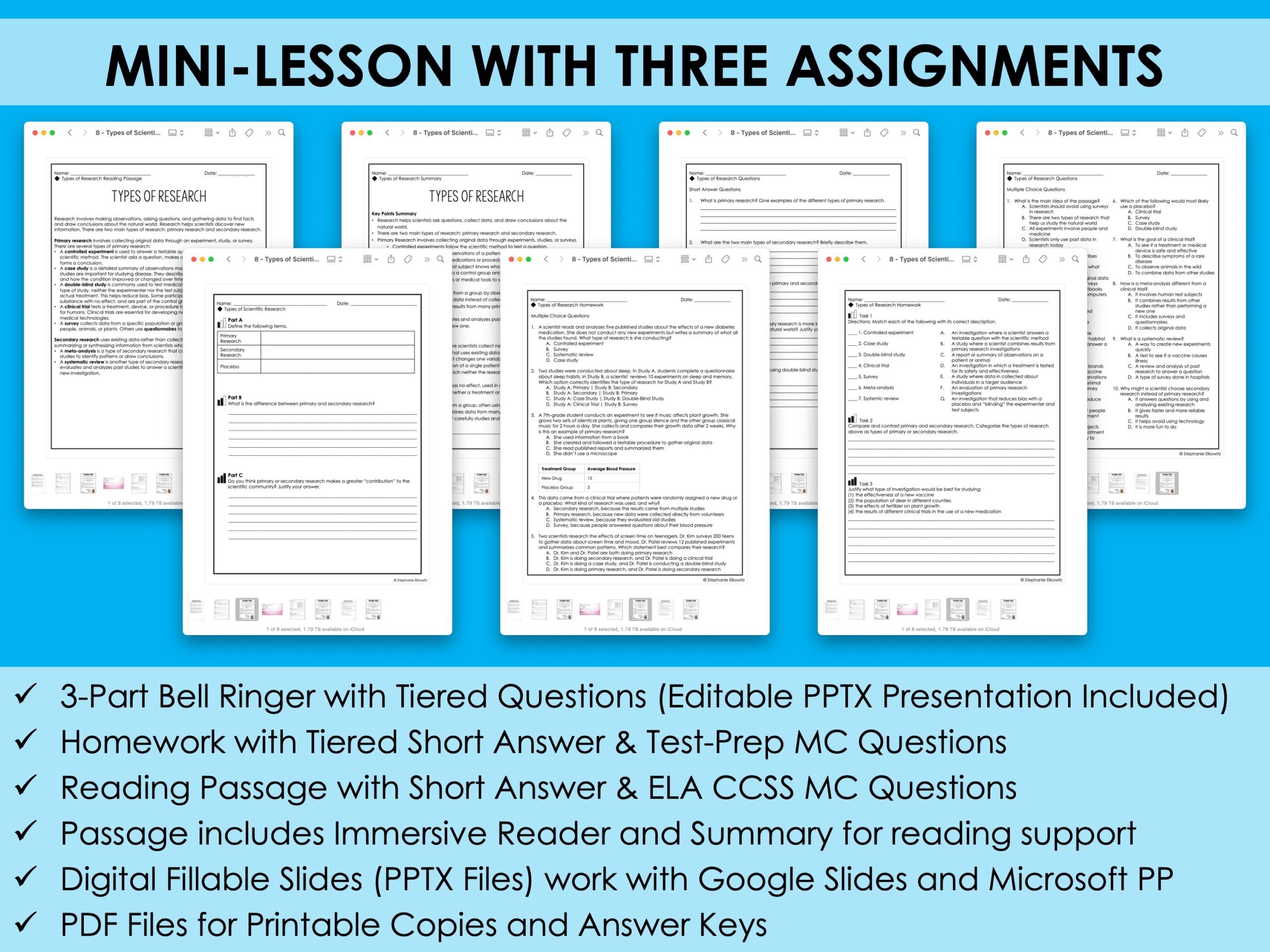 A pack of activities perfect for a mini-lesson or sub plans! Three-part bell ringer designed to be a warm-up or exit slip. Homework with tiered short answer and multiple choice standardized test-style questions. Reading passage with short answer and multiple choice ELA CCS questions. Immersive reader capabilities allow passage to be read aloud or translated into 200+ languages. Printable and digital activities included.